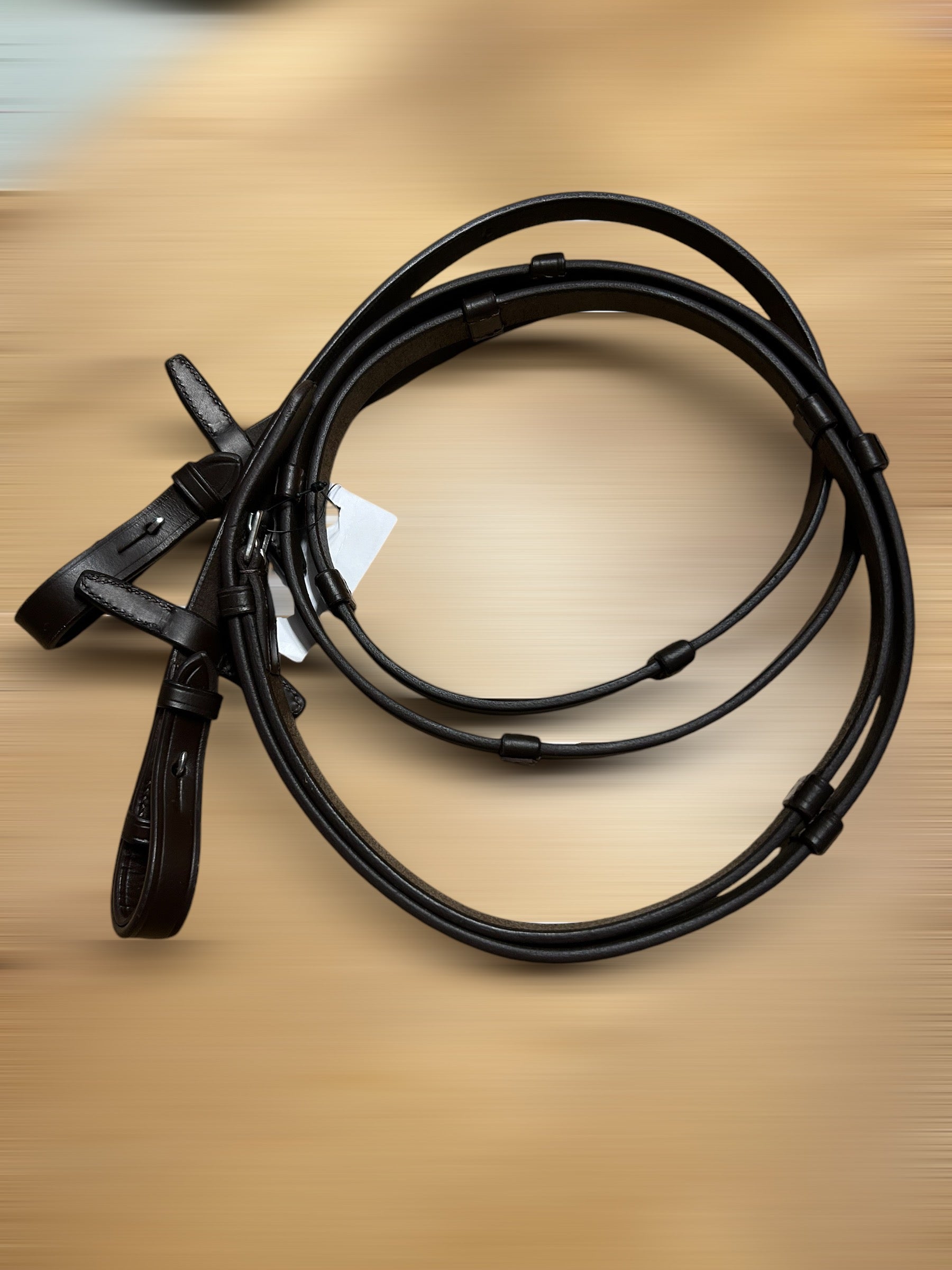 Die Trense ist in einem eleganten Braunton gehalten und besteht aus hochwertigem, weichem Leder, das sowohl langlebig als auch geschmeidig ist. Ein besonderes Highlight ist der schnellwechselbare Stirnriemen, der es Ihnen ermöglicht, je nach Anlass und Stimmung schnell zwischen verschiedenen Designs zu wechseln. So können Sie die Trense individuell anpassen und Ihrem Pferd einen stilvollen Look verleihen. Die Trense ist auch mit unseren braunen Loops mit Klick-System kompatibel.