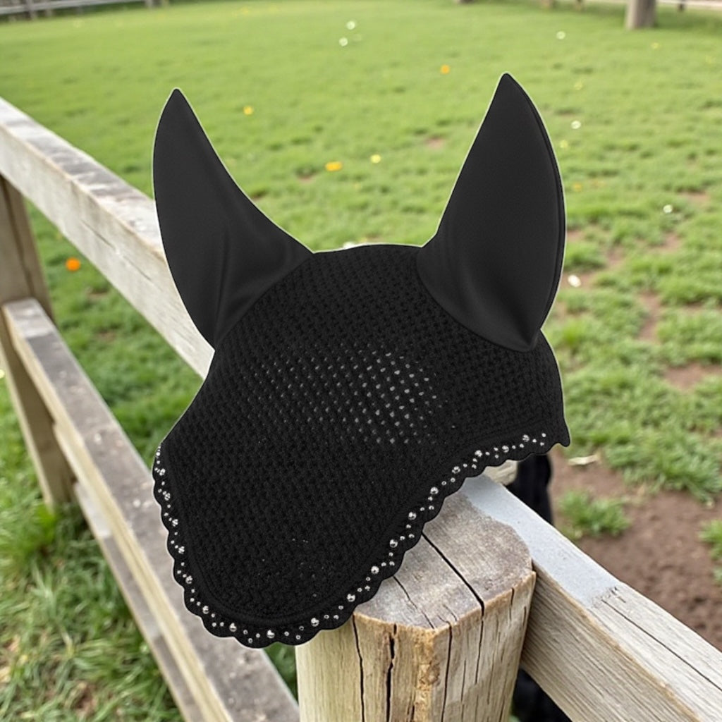 Diese Fliegenhaube ist sorgfältig gehäkelt und bietet nicht nur Schutz vor Insekten, sondern auch eine stilvolle Ergänzung zur Reitausrüstung.