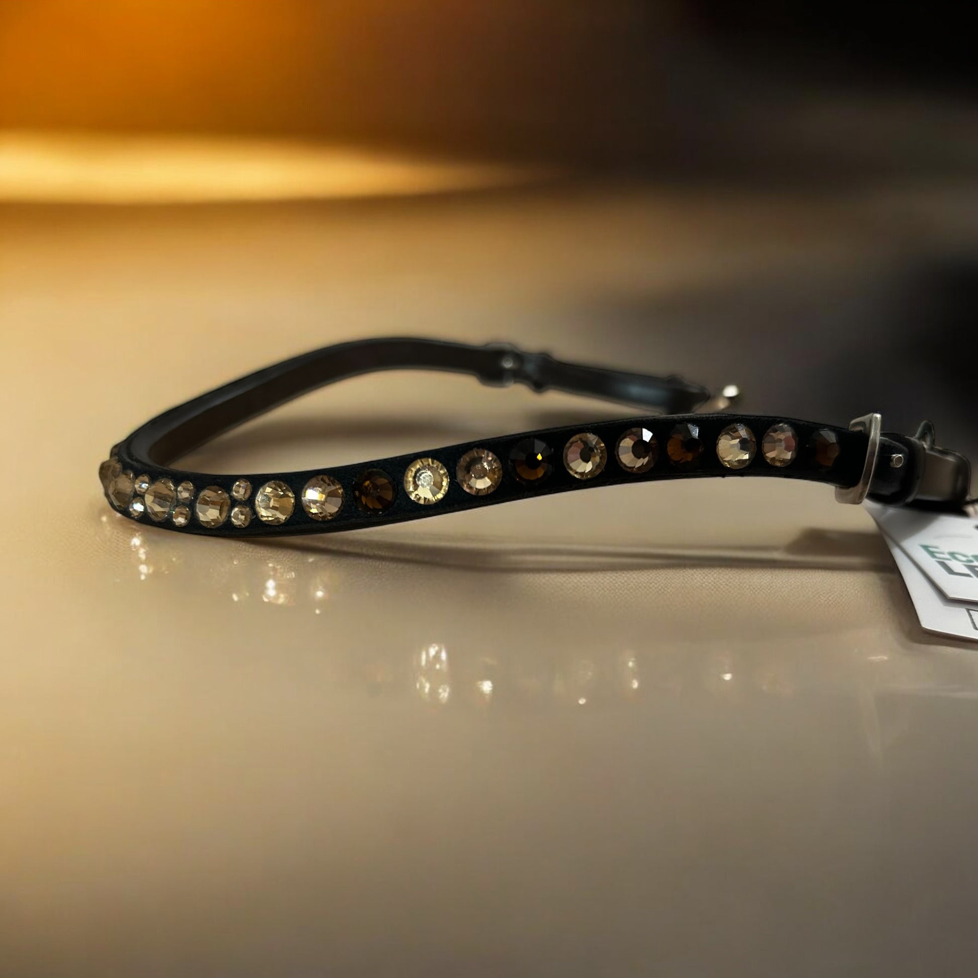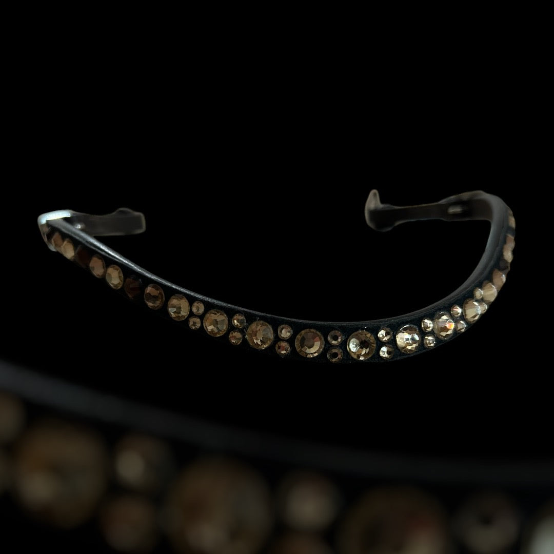 Die Farbgestaltung enthält strahlenden Topaz, ein leuchtendes Goldgelb, das die Augen des Betrachters sofort anzieht. Die Kombination mit dem zarten Light Colorado Topaz, einem sanften, helleren Ton, schafft einen harmonischen Übergang, der sowohl klassisch als auch modern wirkt. Abgerundet wird das Ensemble durch den tiefen, rauchigen Ton des Smoked Topaz, der dem Stirnriemen eine subtile, edle Note verleiht.