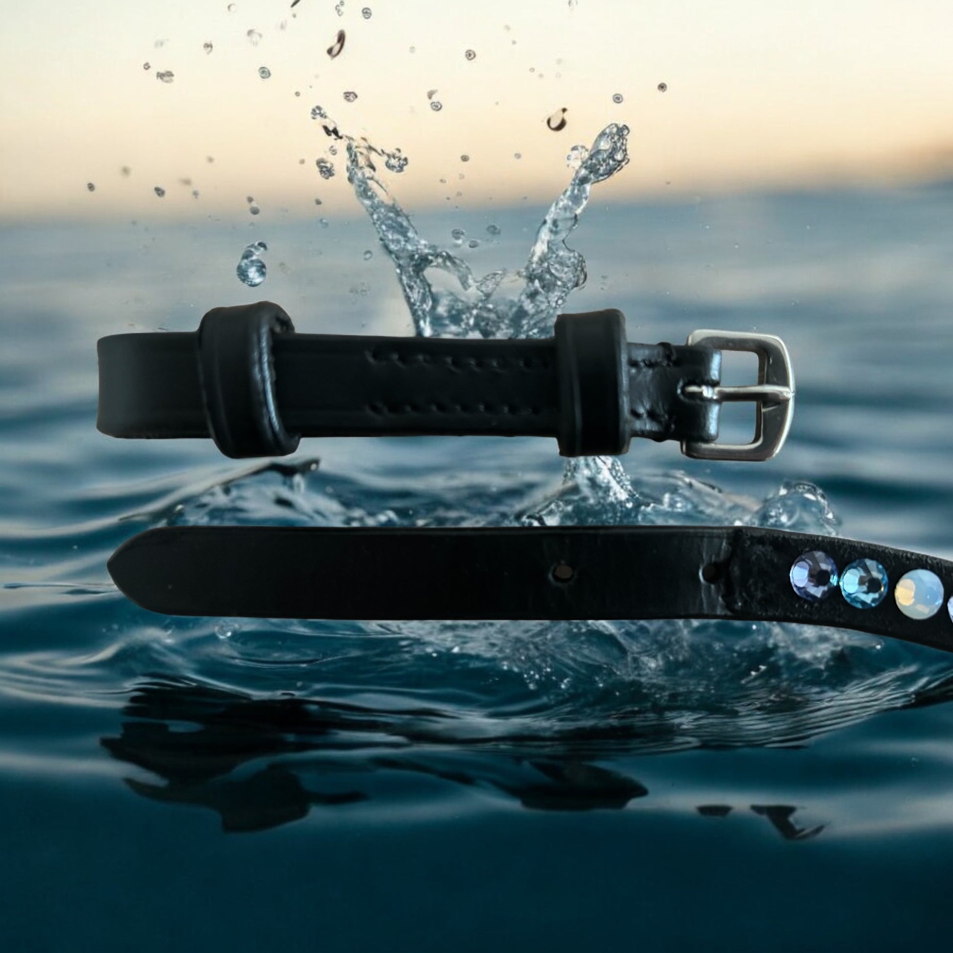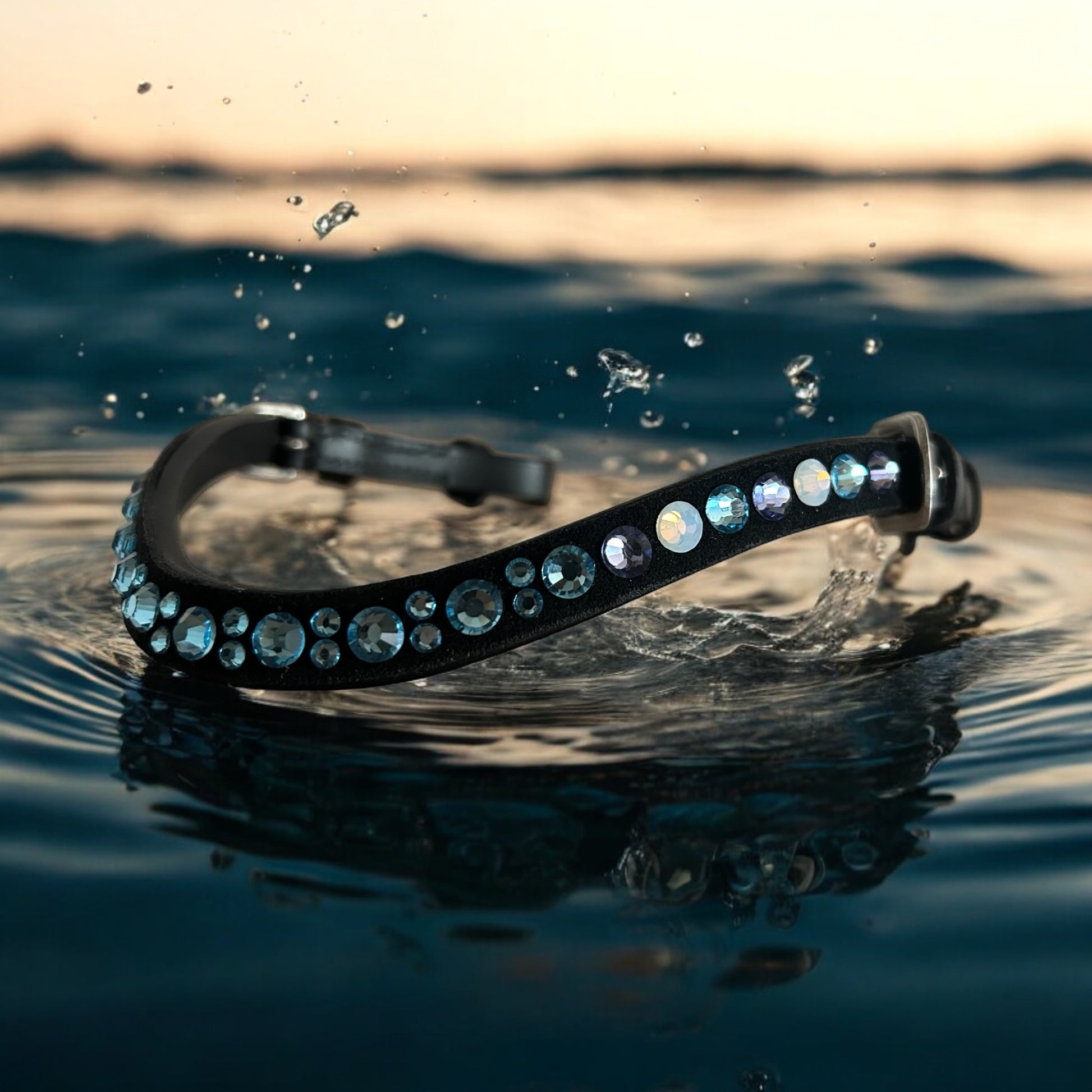 Ein beeindruckendes, größenverstellbares Pferdestirnband, das die Eleganz von Aquamarin-Kristallen mit der Anmut eines Pferdestirnbandes vereint. Die funkelnden Kristalle in Aquamarin-Blau verleihen dem Stirnband einen Hauch von Magie und lassen es im Licht schimmern wie das klare Wasser des Meeres. Die Verbindung von edlem Leder mit den glamourösen Kristallen macht dieses Stirnband zu einem wahren Kunstwerk, das die Schönheit und Kraft der Pferdewelt widerspiegelt. Ein Accessoire, das nicht nur beim Reiten, sondern auch bei besonderen Anlässen begeistern wird.
