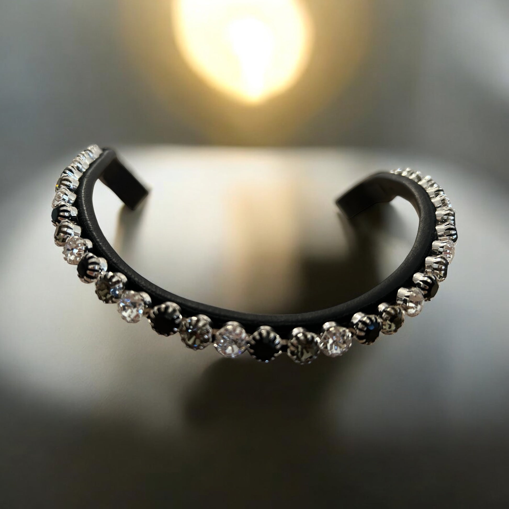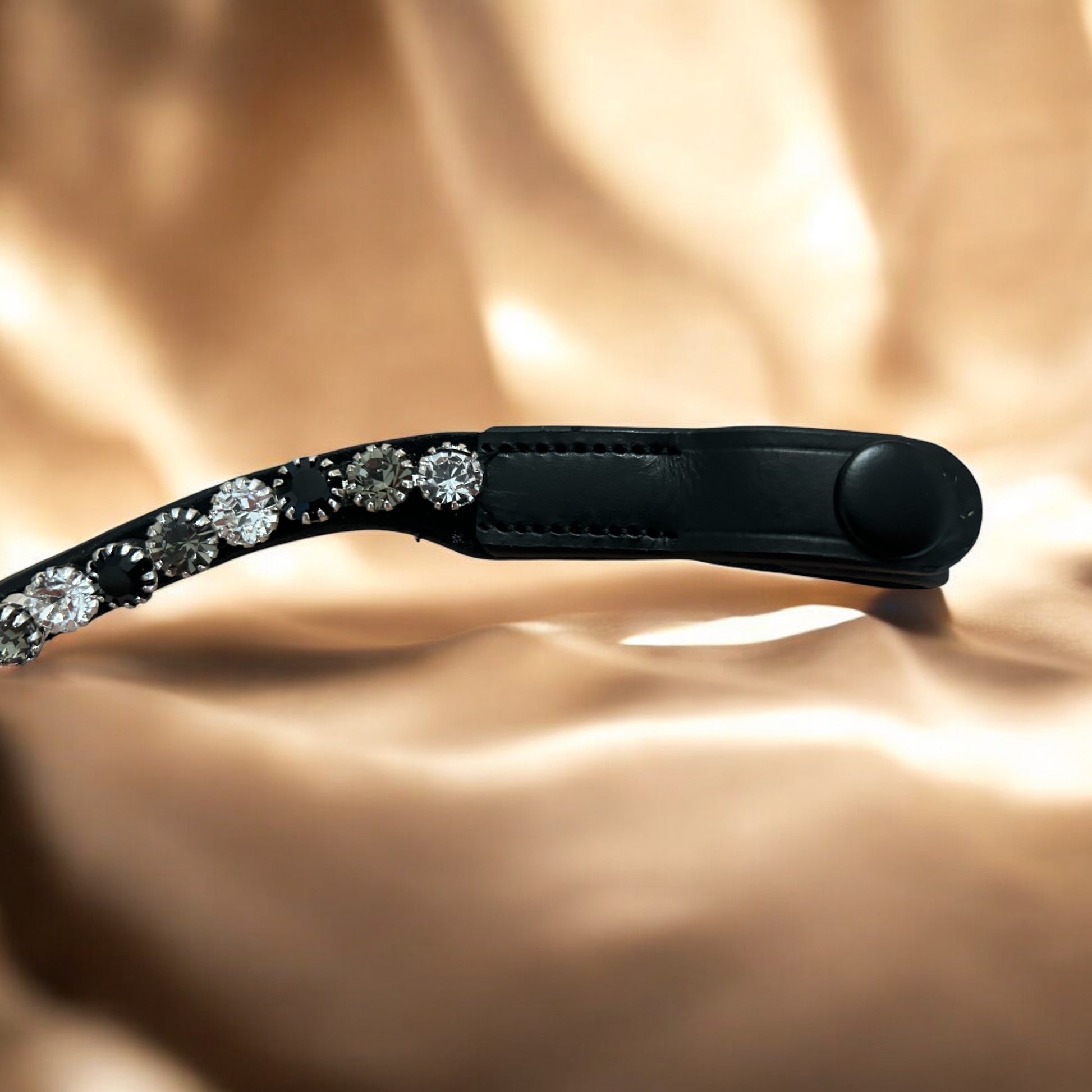 Das Design wird von glitzernden Steinen in den strahlenden Farben Jet, Grey und Kristall hervorgehoben. Die tiefschwarzen Jet-Steine fangen das Licht auf elegante Weise ein, während die grauen Steine subtile Akzente setzen und für eine moderne Note sorgen. Die Kristallsteine hingegen verleihen dem Stirnriemen einen funkelnden Glamour und bringen ihn zum Strahlen.