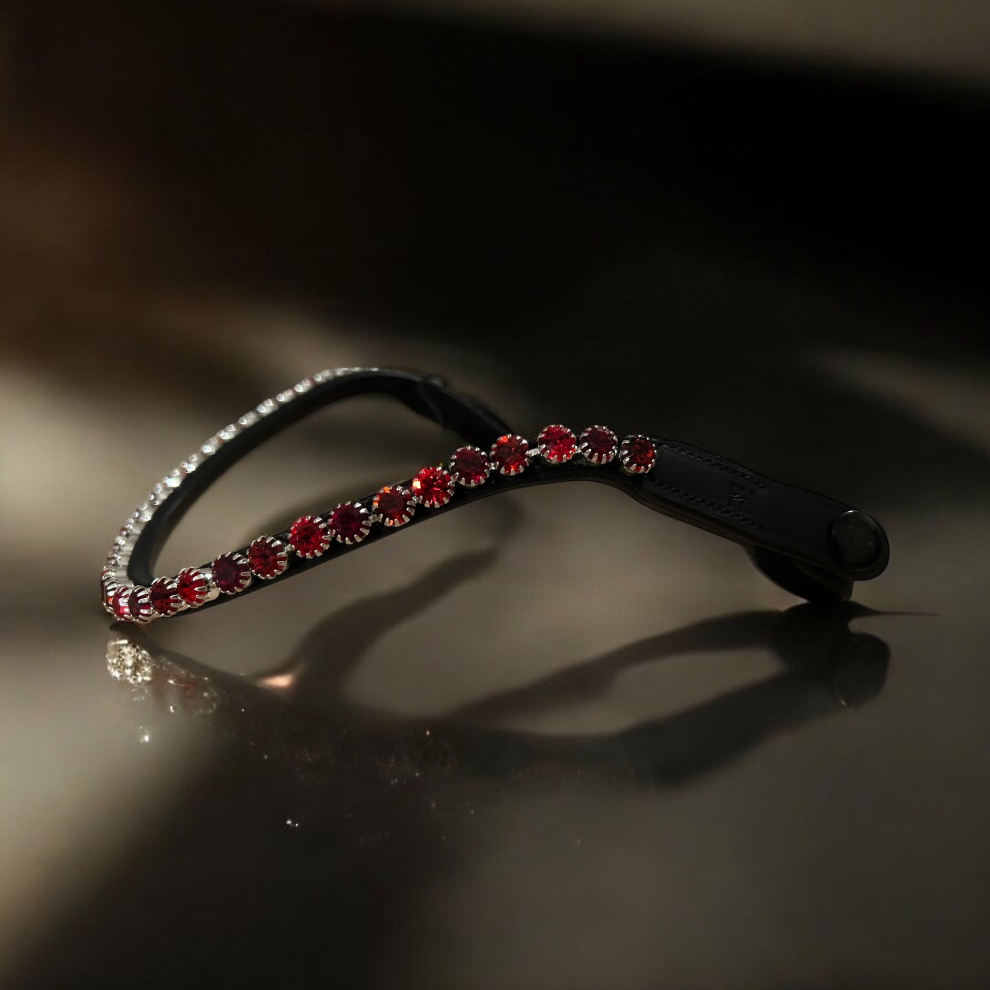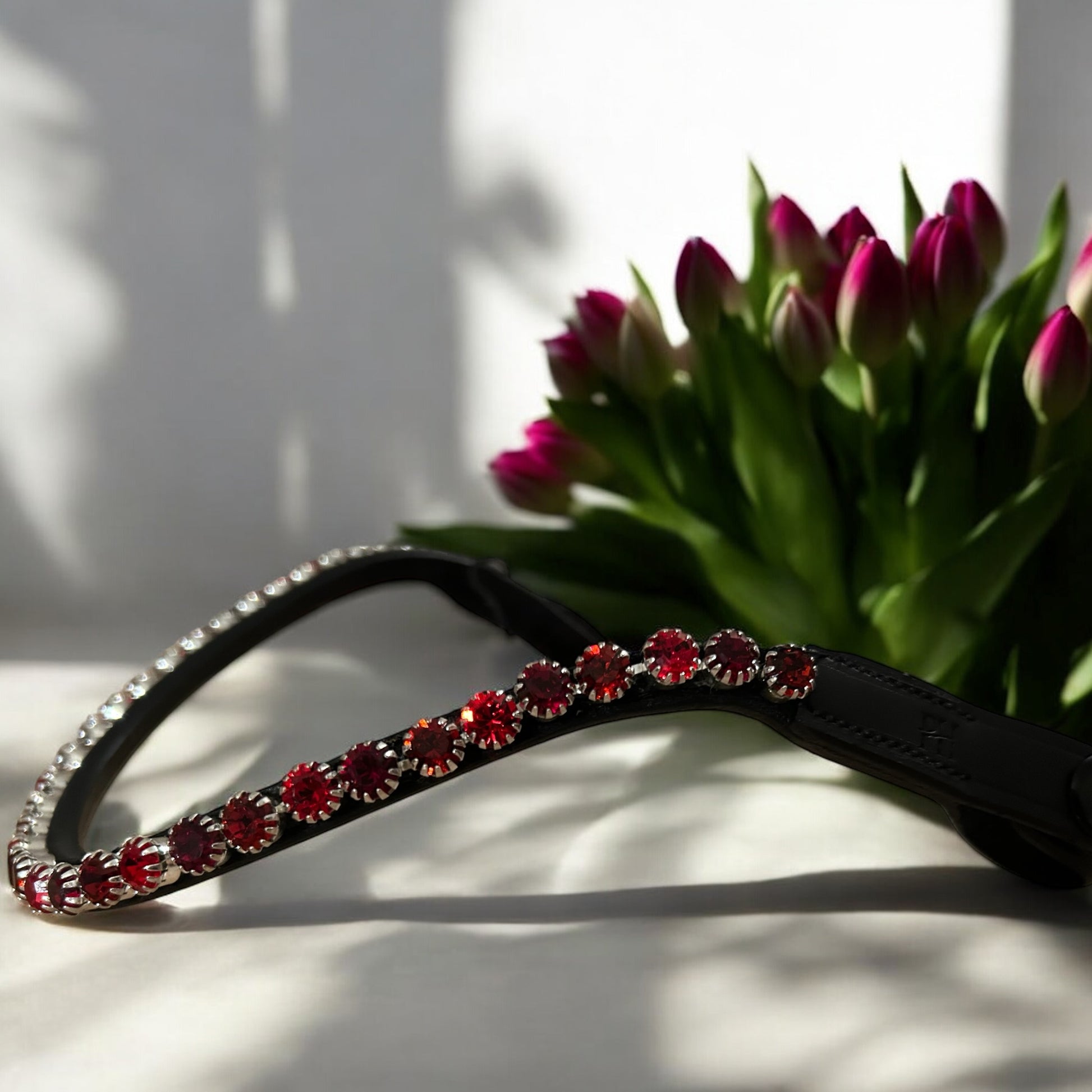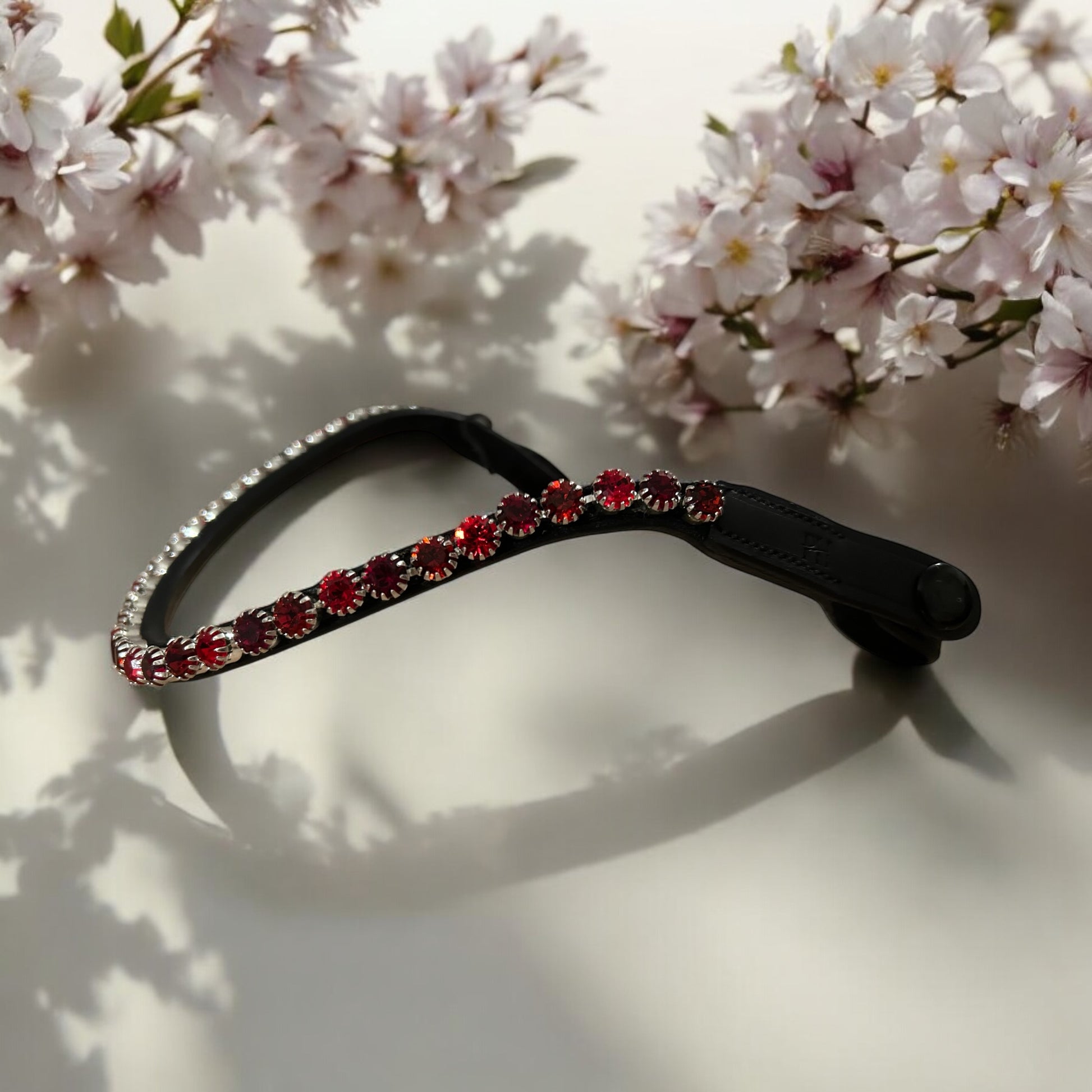 Das Design wird von glitzernden Steinen in den in verschiedenen roten Farbtönen hervorgehoben. Die Kristallsteine verleihen dem Stirnriemen einen funkelnden Glamour und bringen ihn zum Strahlen.